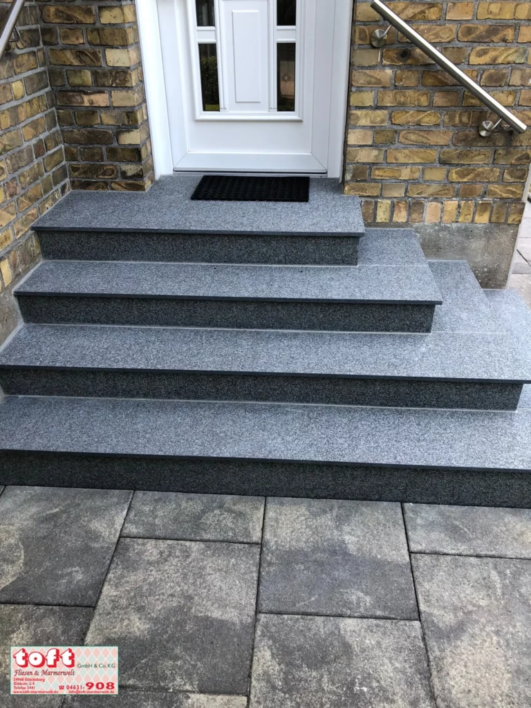 Im Innenbereich sorgt die polierte Oberfläche unserer Treppen für eine elegante Optik und eine rutschhemmende Wirkung. Im Außenbereich empfehlen wir sandgestrahlte oder geflammte Oberflächen, die besonders robust und widerstandsfähig gegenüber Witterungseinflüssen sind.